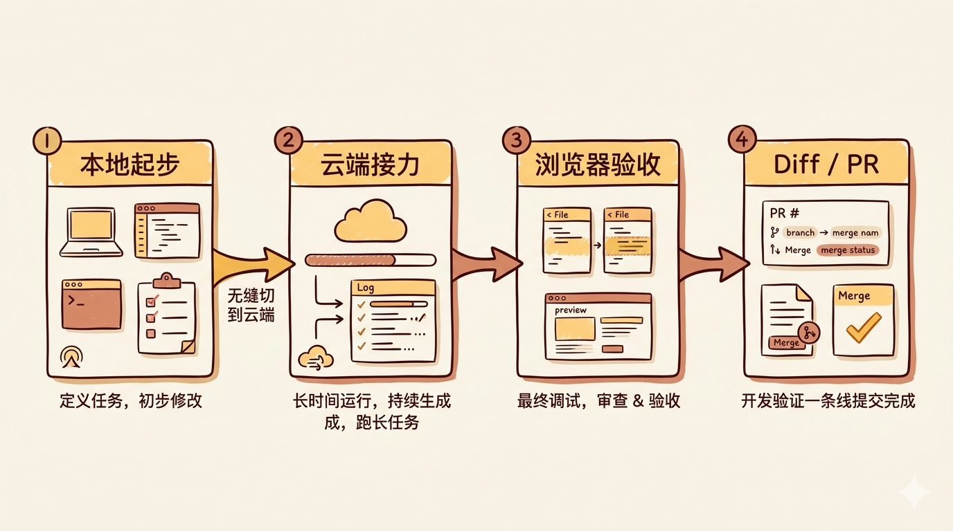 第一,本地和云端 Agent 可以来回 handoff。你可以先在本机把需求讲清楚、打开仓库、做初步修改;如果任务比较长,就把 session 切到云端继续跑。等它产出 diff、日志、预览后,再拉回本地做调试和最后确认。这比过去“关电脑任务就断掉”顺太多。